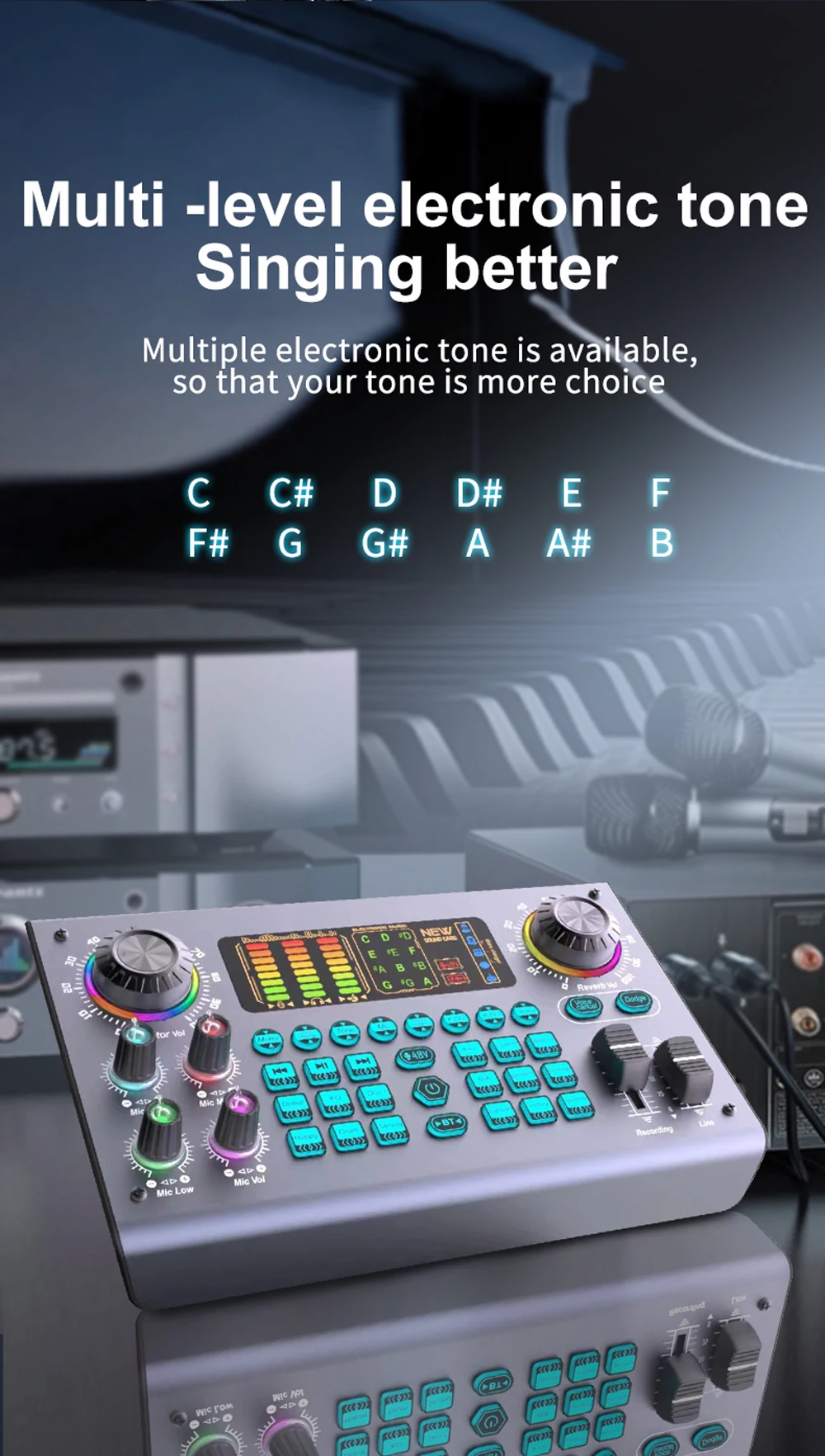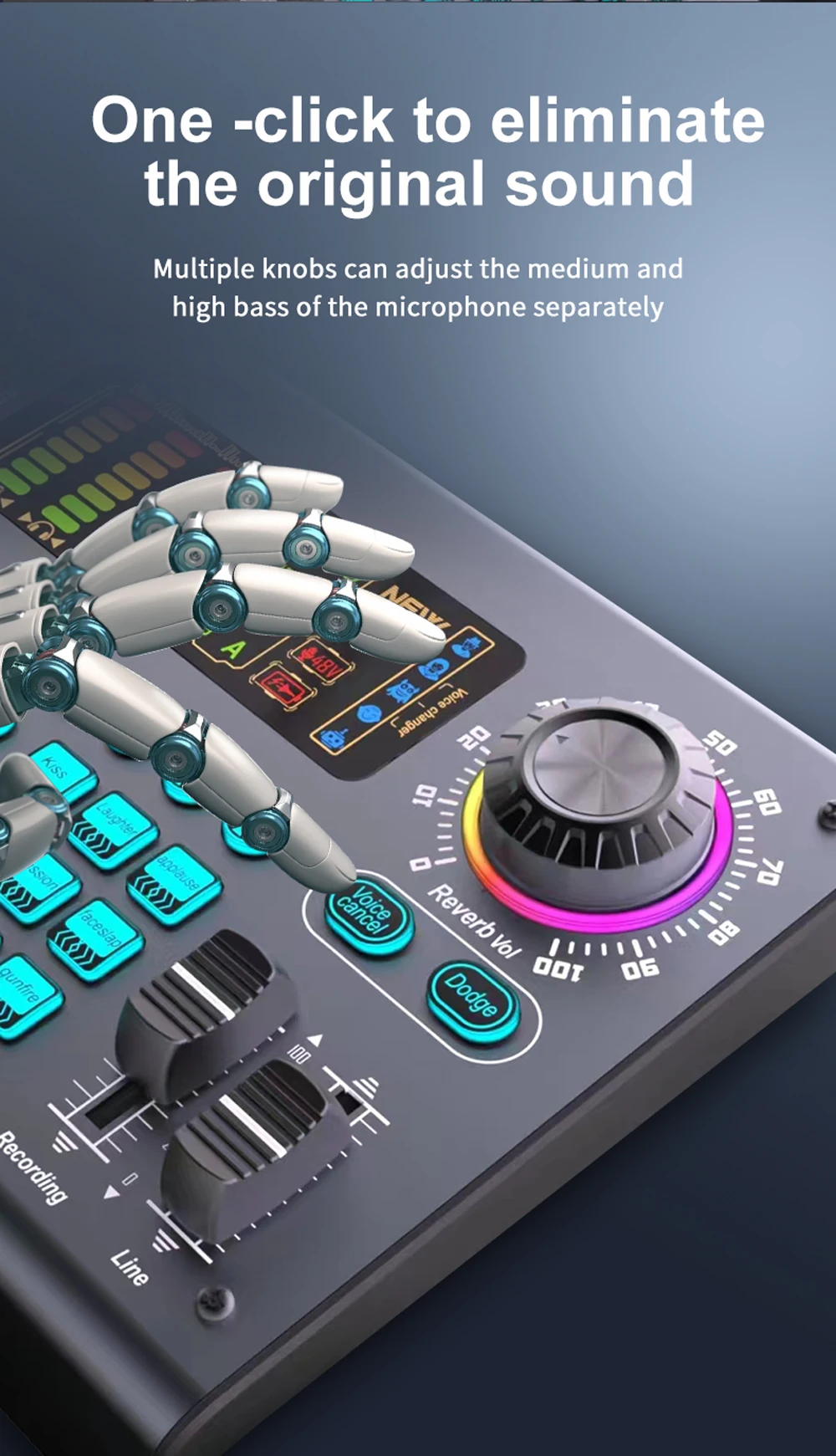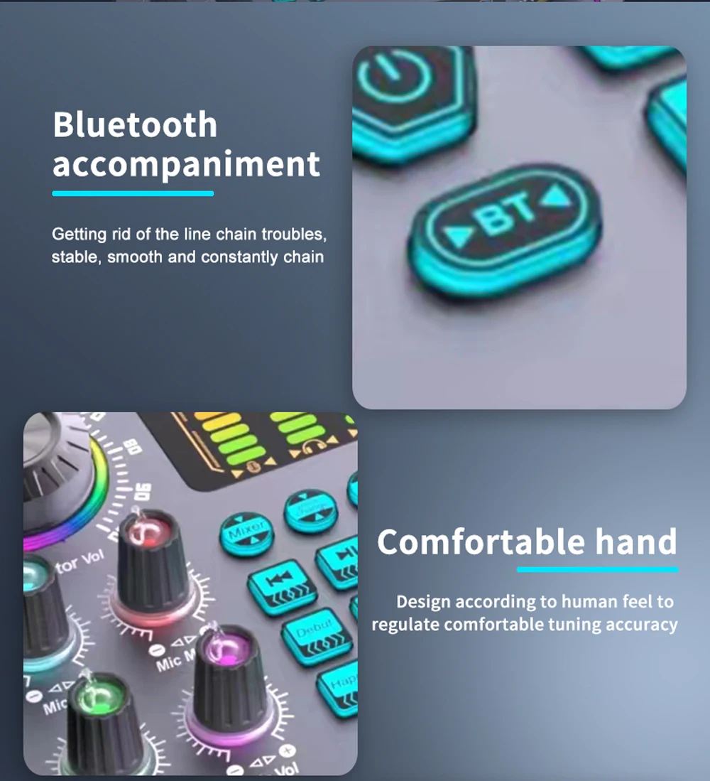 Built-in high-performance DSP noise reduction audio chip, 4 times the processing speed of ordinary sound cards, 2 large knobs: adjust the volume of the microphone and accompaniment, 6 long track push buttons: adjust treble/bass, voice changing, reverb, monitoring, recording, accompaniment balance, as well as B-T accompaniment, it will bring you the perfect sound quality enjoyment for your live broadcast and recording.