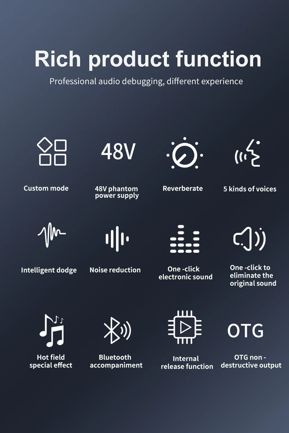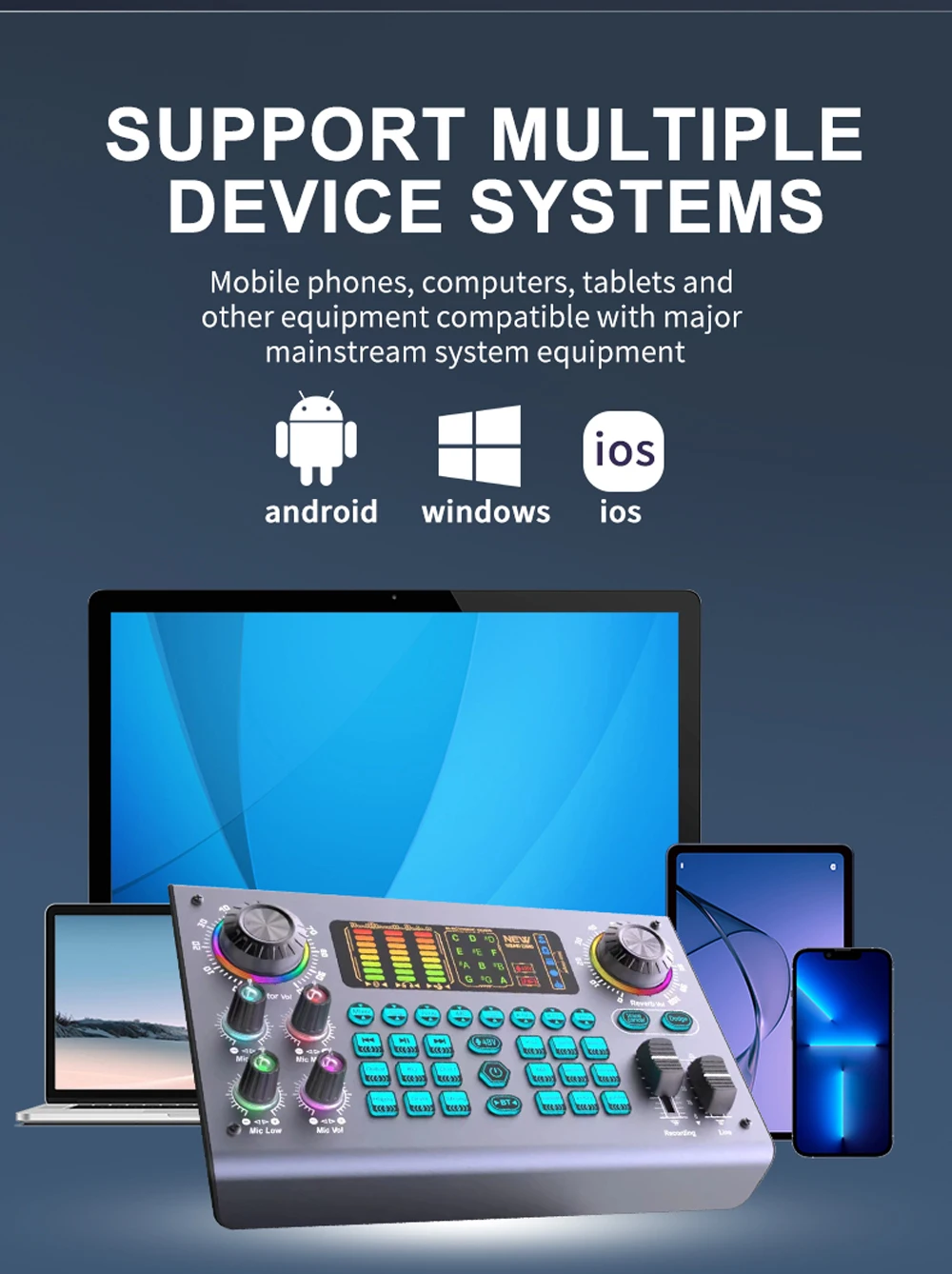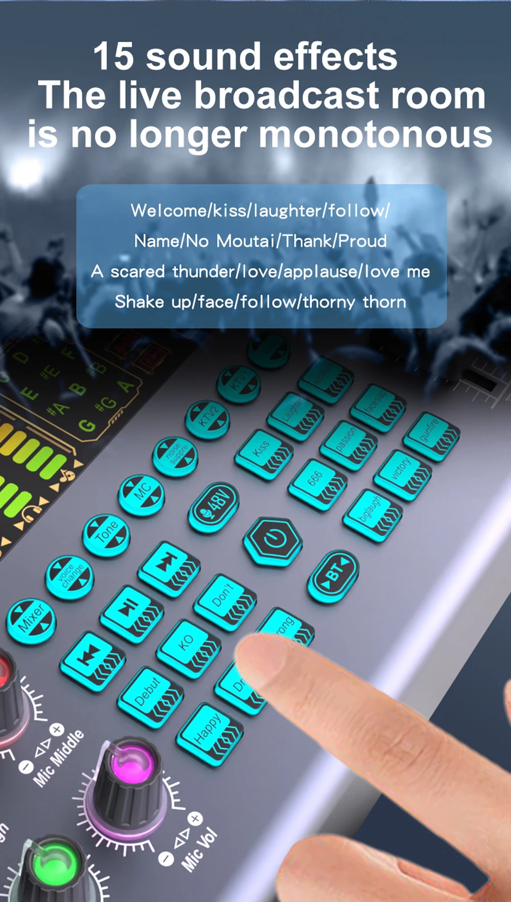 Built-in high-performance DSP noise reduction audio chip, 4 times the processing speed of ordinary sound cards, 2 large knobs: adjust the volume of the microphone and accompaniment, 6 long track push buttons: adjust treble/bass, voice changing, reverb, monitoring, recording, accompaniment balance, as well as B-T accompaniment, it will bring you the perfect sound quality enjoyment for your live broadcast and recording.
