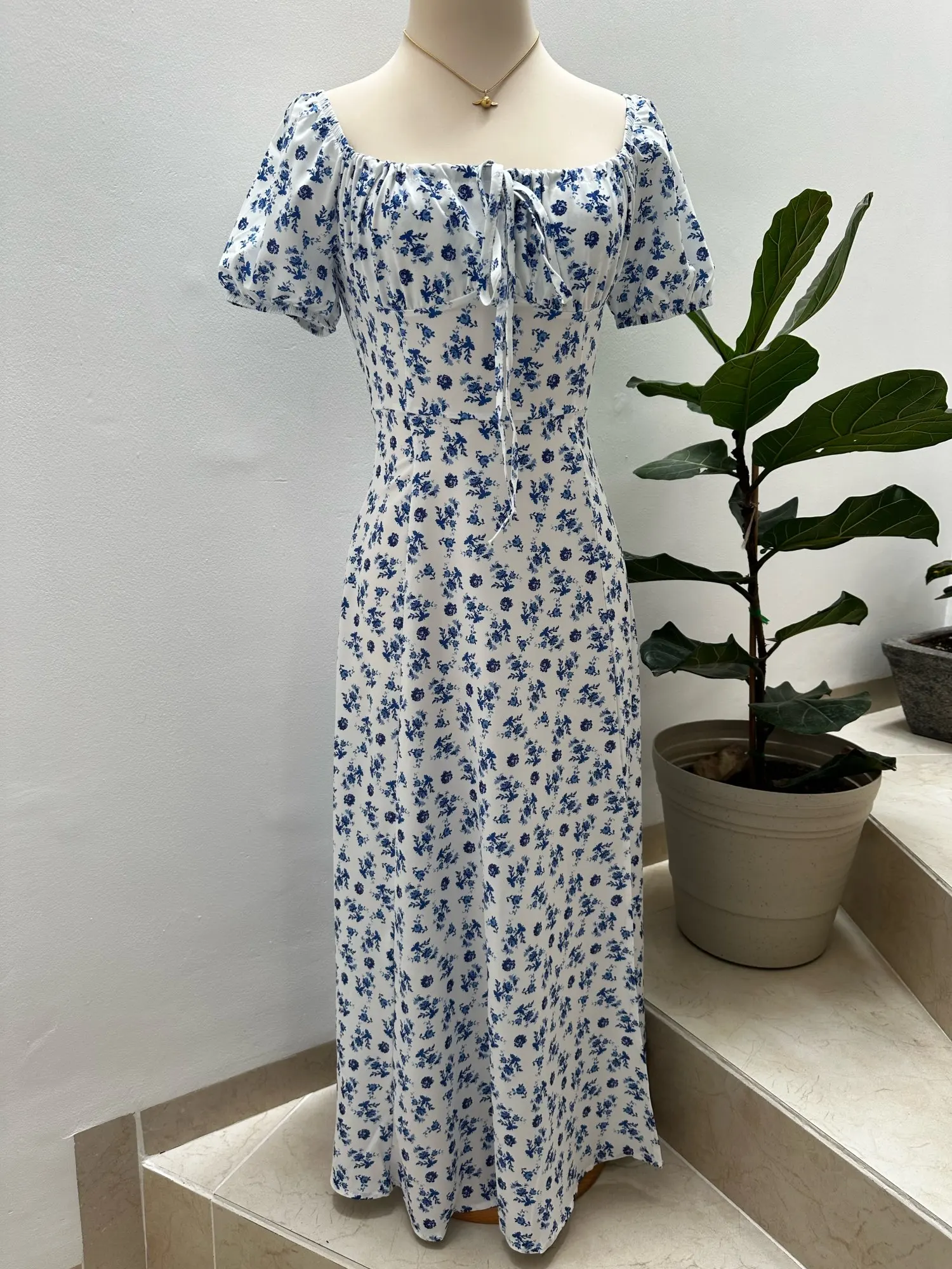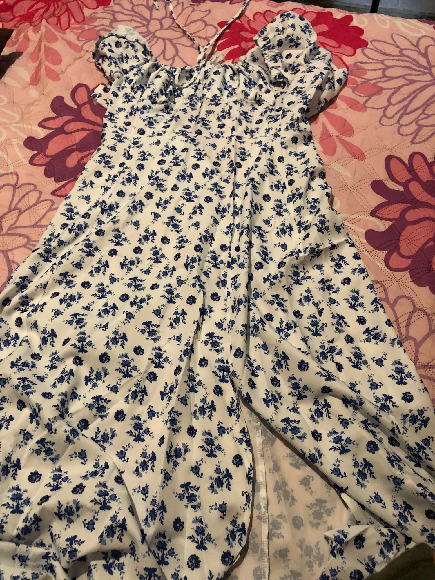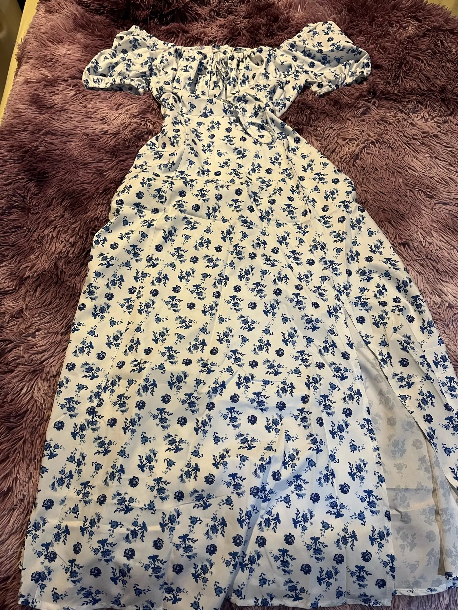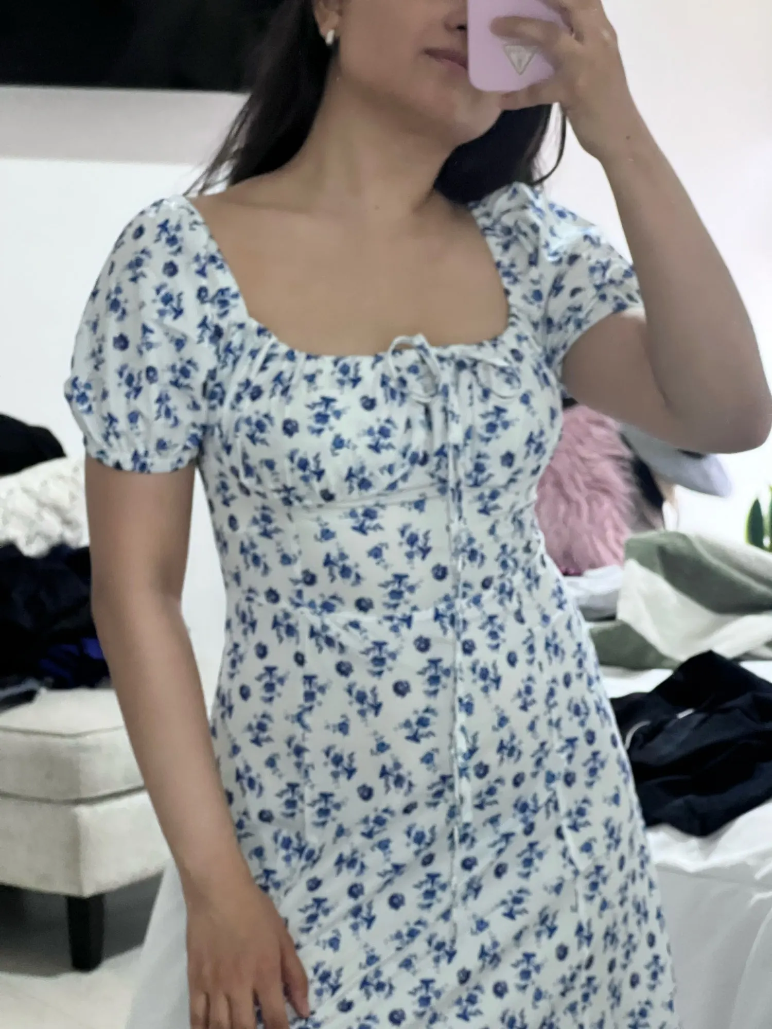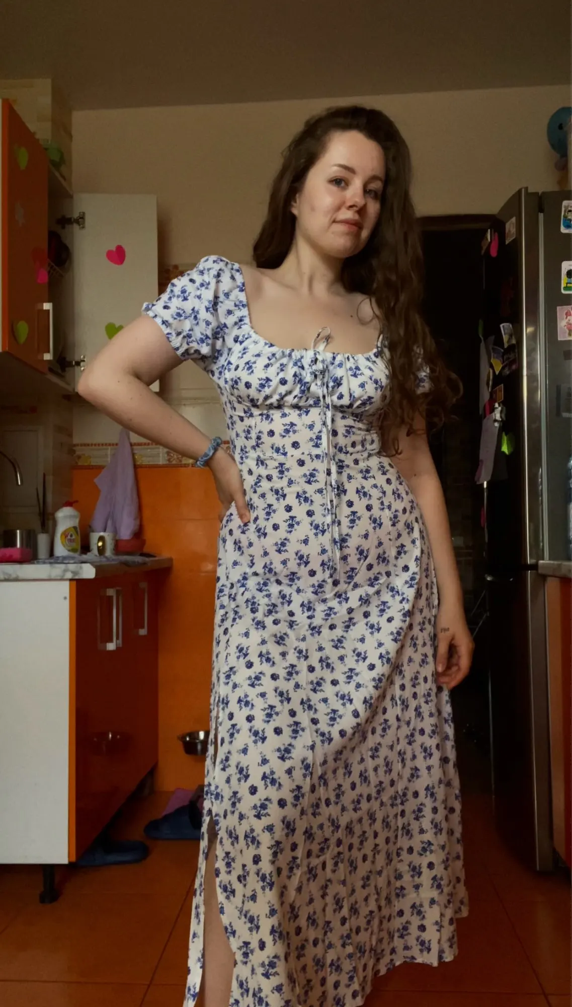OMG. this dress is literally the prettiest dress ive ever seen!! its so airy yet not baggy to look bad on me. i struggle a lot with dresses as they always are too big for me, but the first time this is actually so pretty! the length is perfect for me (im 4’11 for ref) and it’s honestly so perfect for sizing! the fabric is amazing and so so soft. i really recommend this!! the only thing i would say that it’s not right around the waist, so if your looking for one like that this probably isn’t good for you however it still has a slimming effect!!