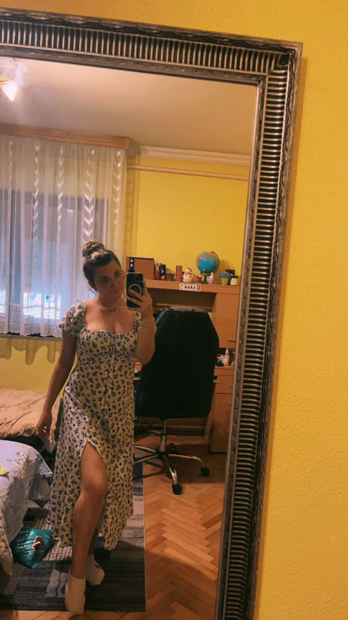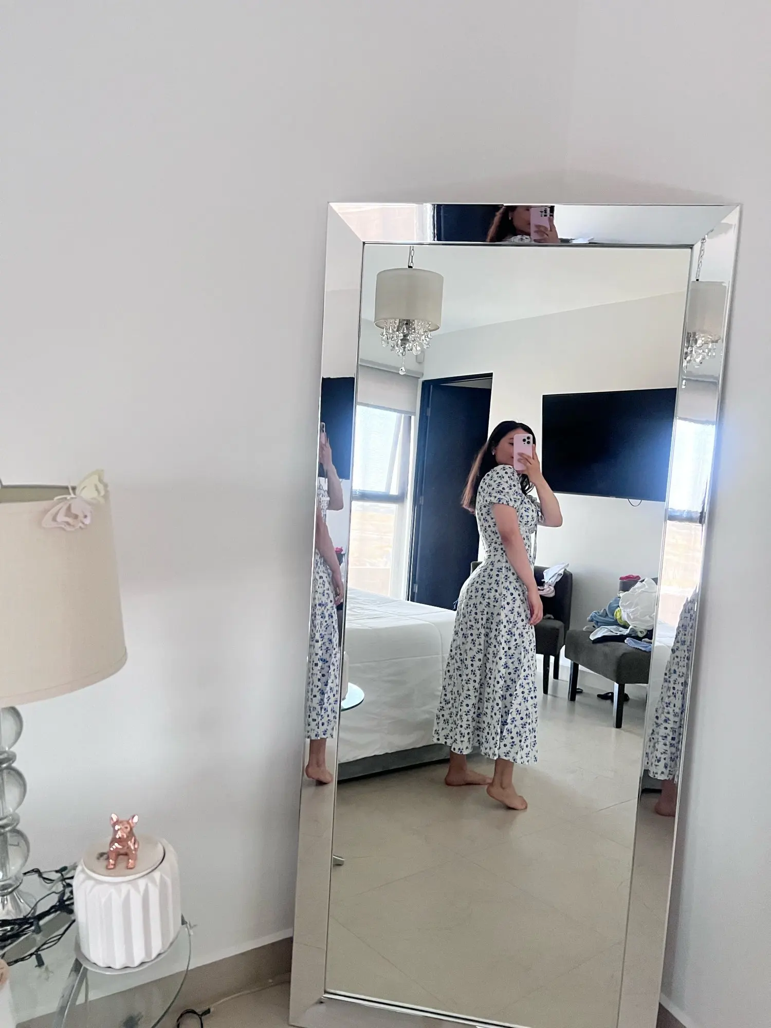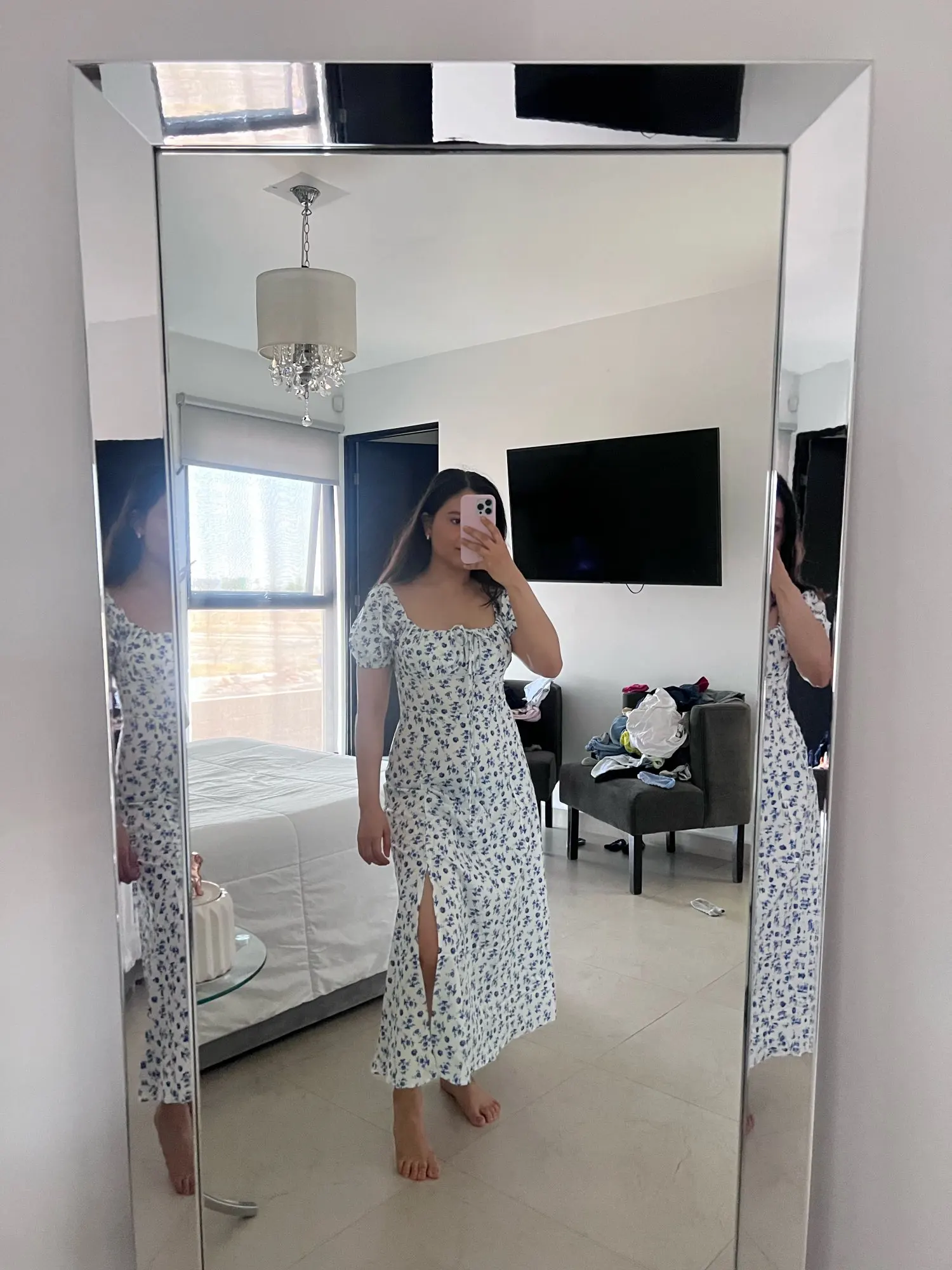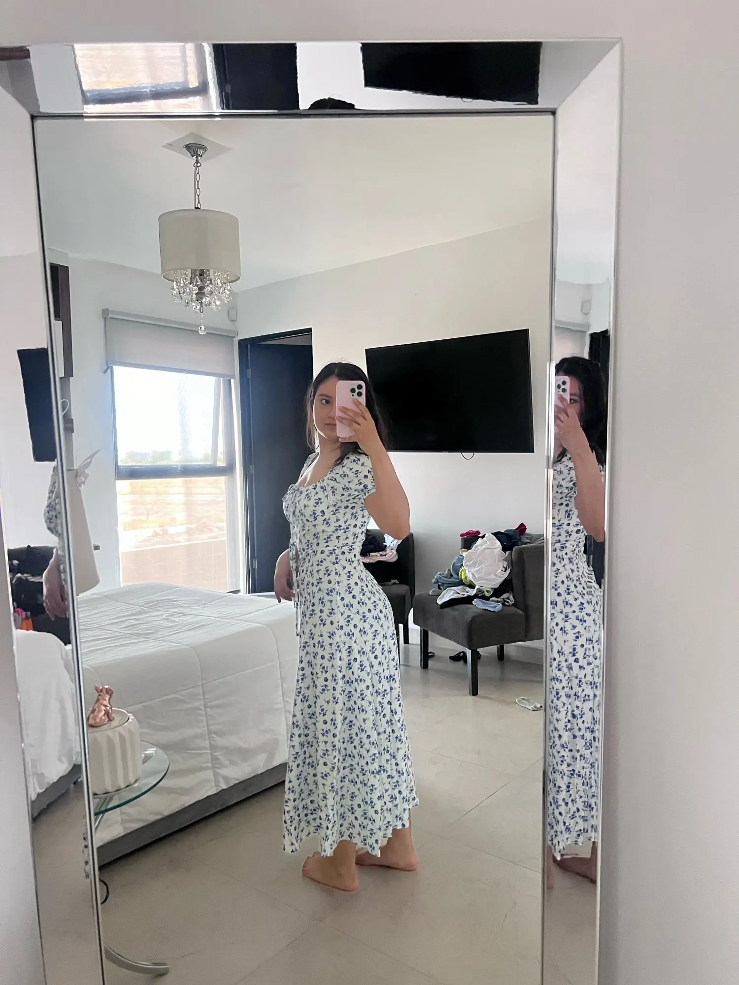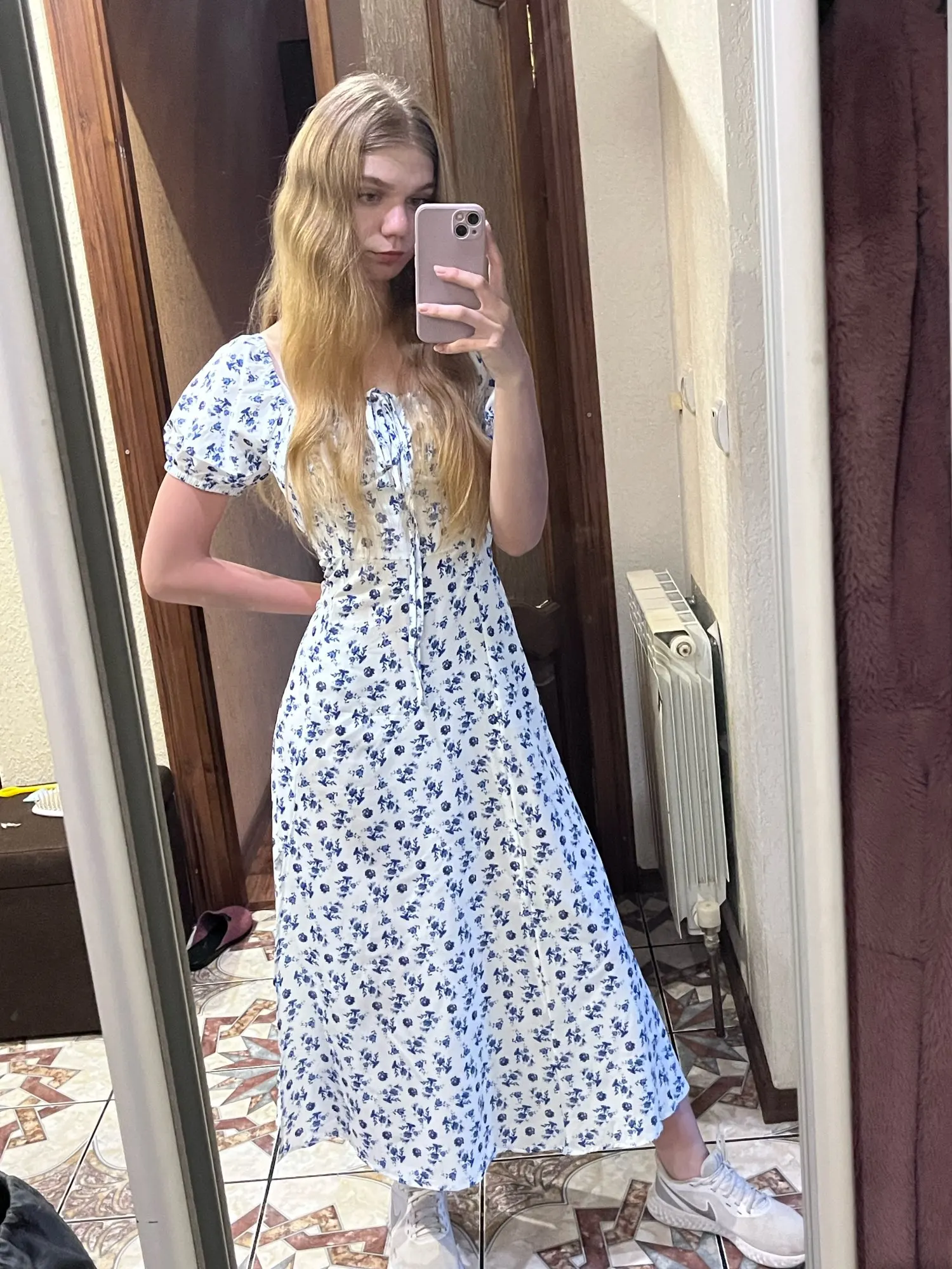 OMG. this dress is literally the prettiest dress ive ever seen!! its so airy yet not baggy to look bad on me. i struggle a lot with dresses as they always are too big for me, but the first time this is actually so pretty! the length is perfect for me (im 4’11 for ref) and it’s honestly so perfect for sizing! the fabric is amazing and so so soft. i really recommend this!! the only thing i would say that it’s not right around the waist, so if your looking for one like that this probably isn’t good for you however it still has a slimming effect!!